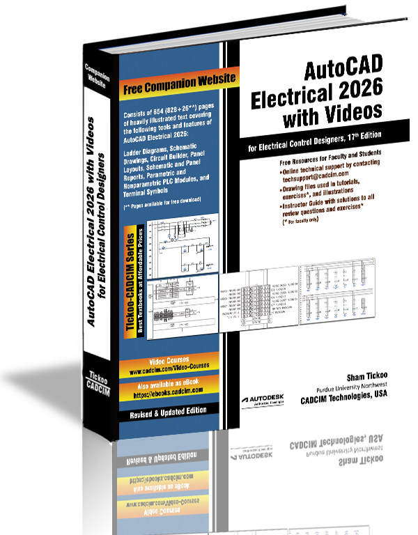 The AutoCAD Electrical 2026 with Videos for Electrical Control Designers book has been written to assist the engineering students and the practicing designers who are new to AutoCAD Electrical. Using this book, the readers can learn the application of basic tools required for creating professional electrical control drawings with the help of AutoCAD Electrical. Keeping in view the varied requirements of the users, this book covers a wide range of tools and features such as schematic drawings, Circuit Builder, panel drawings, parametric and nonparametric PLC modules, stand-alone PLC I/O points, ladder diagrams, point-to-point wiring diagrams, report generation, creation of symbols, and so on. This will help the readers to create electrical drawings easily and effectively. In this edition, the author has covered enhancements in topics such as Wire type synchronization, Automatic reports, BOM reports, and Symbol list reports.